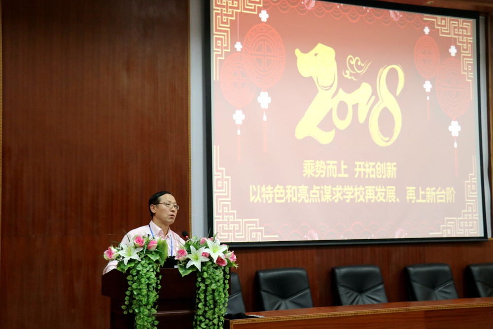 随后,罗荣禄校长对学校2018年工作做全面部署,他以《乘势而上,开拓创新,以特色和亮点谋求学校再发展、再上新台阶》为题,对学校2017年工作取得的主要成绩进行了简要回顾,对2018年工作的指导思想、工作目标和工作措施,进行了全面深入的阐述,指出2018年是我校的“质量效益年”,也是学校“三五”规划全面实施的开篇之年,要认真学习贯彻“十九大”精神,以人社部技工教育“十三五”规划和省市关于技工教育改革与创新发展行动计划为指导,认清形势,明确发展定位,科学规划建设,坚持内涵发展,实施质量管理,努力提升学校办学规格和档次。