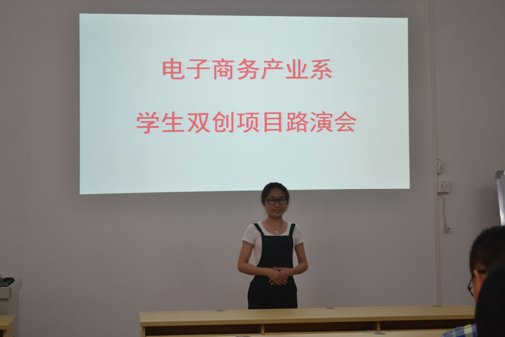 首先路演的项目是黄倩老师指导的广州碧凡外贸时装有限公司。公司经营四家敦煌网店,团队由陈东风等四位2016级高技跨境班的学生组成。在短暂的7分钟演讲中,主讲人伍慧嫦同学从公司简介、产品及服务、营销理念等方面阐述了公司的综合情况。