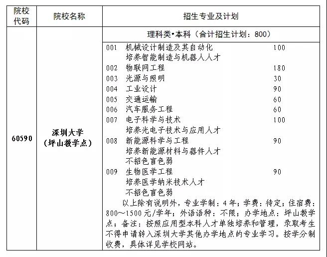 应有关地市政府及高校要求,现对深圳大学2018年普通高考院校代码、招生专业及计划作部分调整。在深圳大学原院校代码、招生专业及计划不变的基础上,另设一个60590院校代码,招生专业及计划等详见下表。 院校咨询电话:0755-23256666。