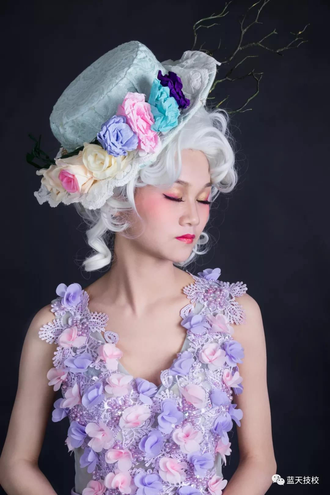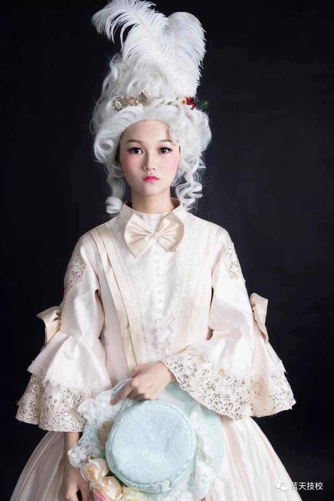 洛可可流行于法国路易十五时代,追求的是柔媚轻佻,讲求的是小巧玲珑,光滑润洁,趋向秀美。夸张的白色假发还原了洛可可的奢华烂漫。妆容上选择白色、金色、粉红这些娇嫩的颜色,让女性充满惬意的轻松感。